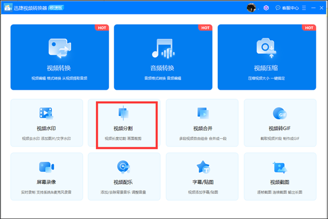 第一步 打开【迅捷视频剪辑软件】,进入首页,看到【视频分割】选项,点击选择。