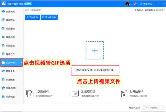 第一步 打开【迅捷视频转换器】,选择【视频转GIF】,并且上传需要转换的视频文件。