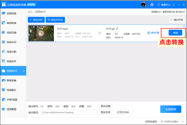 第二步 导入视频文件之后,就会进入到转换页面。在进行转换之前,我们可以对其参数进行设置,设置好之后点击【转换】即可完成。