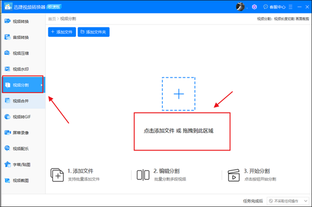 第一步 点击选择【视频分割】选项,并上传需要分段的视频文件。(这里可以上传各种格式的视频文件)