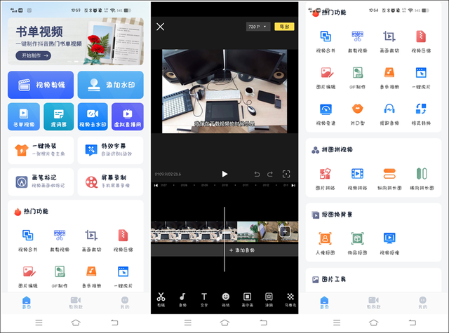 与前两个软件不同的是,这个手机上的视频编辑软件,可以满足我们移动化的需求。随手拍的视频,分分钟就可以剪辑成片。打开软件可以看到软件首页的“视频剪辑”选项,直接点击就可以进行剪辑操作。可以看到操作页面下方有着十分丰富的操作选项。同时在首页我们还可以进行图片的制作、视频格式的转换等操作。