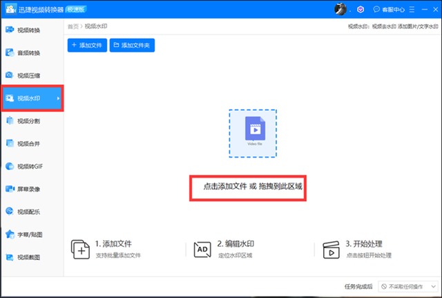 第一步 点击打开软件,看到软件首页的【视频水印】选项,我们点击该选项,然后接下来我们上传需要添加水印的视频文件。