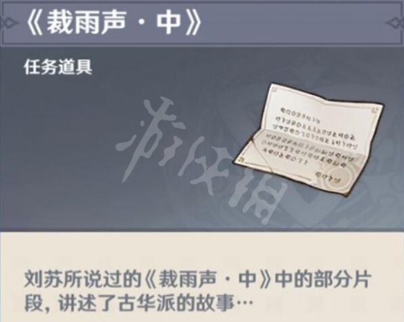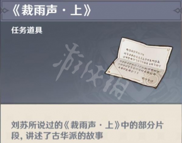 要注意的是裁雨声只有上、中,并不是bug,NPC茂才公处拿到的应该是裁雨声·上,NPC江舟处拿到的是《裁雨声·中》,如果刚好刷到他俩就直接齐了。
