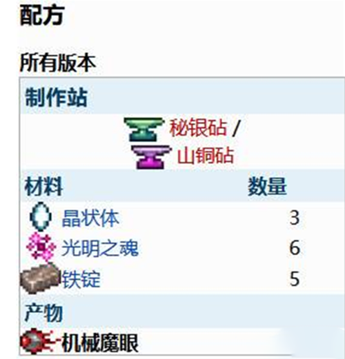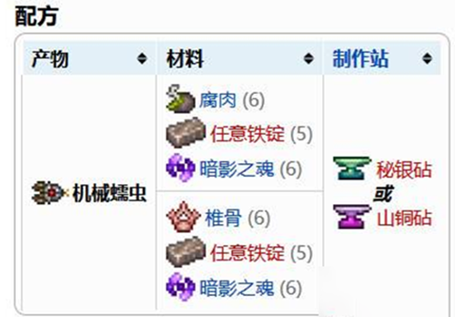 2、机械蠕虫召唤物原料腐肉6或脊骨6、黑暗之魂6、铁锭5。