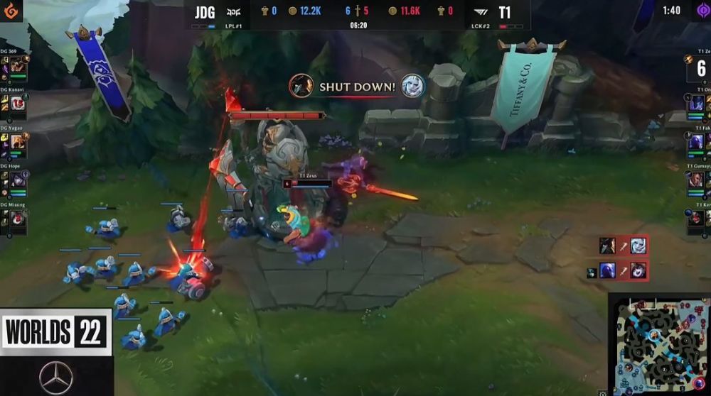 虽然T1输掉了第一局比赛,但他们的卢娜组合玩得很好,这给予JDG不小的BP压力。Yagao的岩雀是这局比赛的MVP,但由于后续阵容不太契合,并没有再度使用。