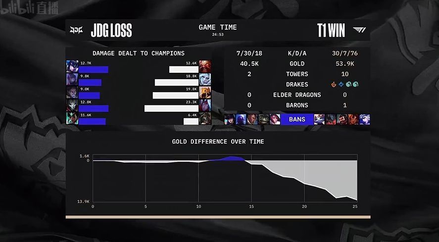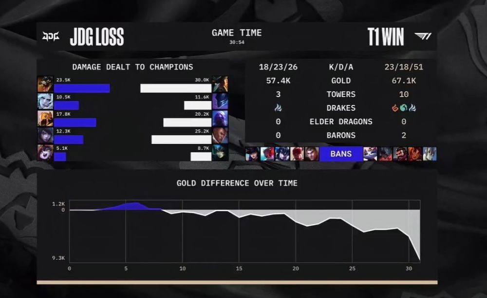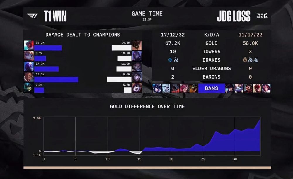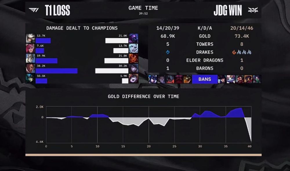 在下路团战打完后,T1灵机一动直接传送打掉大龙,永恩在下路推进时拿到双杀,石头人和塞拉斯就已经看不住他了。在中路高地塔失守后,JDG的视野都是防守视野,这导致他们在蓝buff野区团战被疯狂拉扯,险些被一波拆家。守得住一波守不住第二波,T1轻松赢下胜利。
