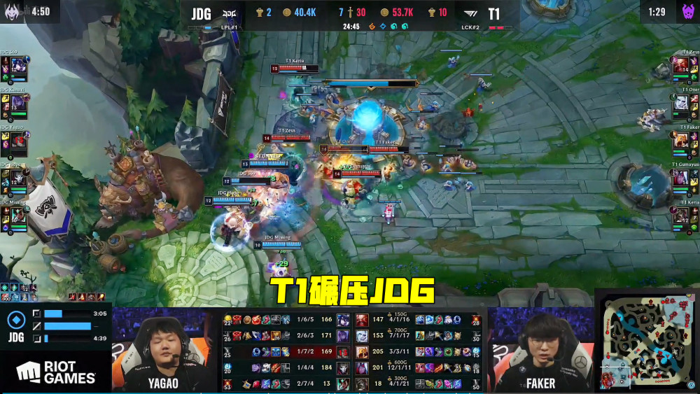 第一局Faker祭出招牌加里奥,前期双方打得十分激烈,经济只有一千块之差。中期JDG率先听牌龙魂,T1的单带节奏起不来,只能通过抓人拿地图资源,击杀上辅后选择Rush大龙逼团,JDG三人打五个反杀Oner,成功阻止对方拿龙。后期T1放龙魂拿大龙,JDG通过拉扯拿到远古巨龙,最后一波Hope爆炸输出融化对手,T1无力防守首局告负。