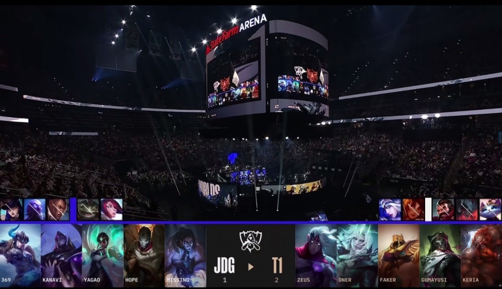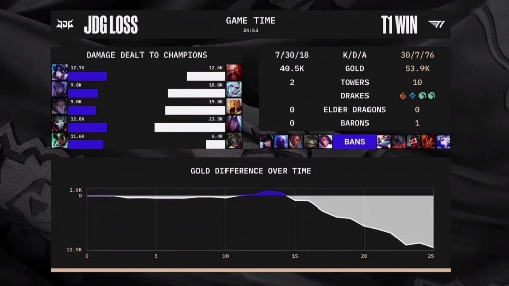 重新整补后JDG下路抓机会但失败被对方再次击杀四人,T1顺利拿下大龙。