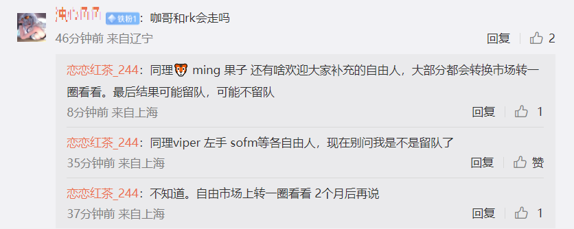 之后还有人问Rookie和Karsa会离开V5吗?恋恋红茶回应:现在还不知道,可能要2个月后才有消息,同样小虎、ming、cryin、Viper、knight和sofm等等自由人选手都是一样,可能留队,也可能留队,应该都会在转会市场上转一圈,看看有没有其他更合适的战队之后,再决定自己明年的去向。