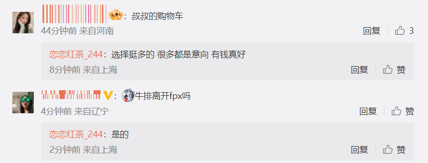 接着有人询问BLG有看中那些选手吗?恋恋红茶回应:BLG的选择很多,对很多选手都有意向,还是很有钱。而有人问牛排是不是离开了FPX,恋恋红茶给出了肯定的答复。