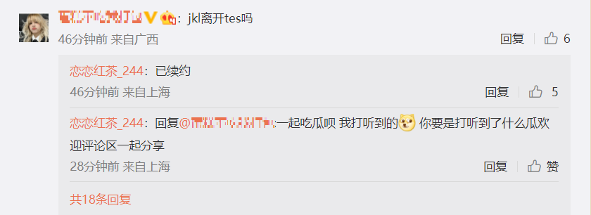 具体的爆料消息如下图所示,有人询问:JKL会离开TES吗?恋恋红茶回应:已经续约了,并且表示这是自己打听到的消息,如果其他人打听到了其他的消息,可以一起分享。