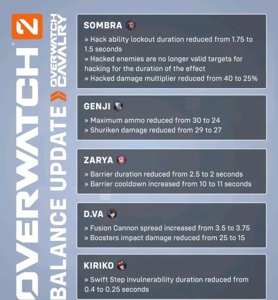 补丁内容主要包括部分英雄的削弱:黑影的伤害降低,伤害系数降低从40%降低至25%,在效果持续时间内,被黑了的敌人也不能再成为黑客攻击的目标;源氏手里剑的伤害降低,弹容量削弱至24;毛妹的护盾持续时间降低,冷却增加......具体参照下图: