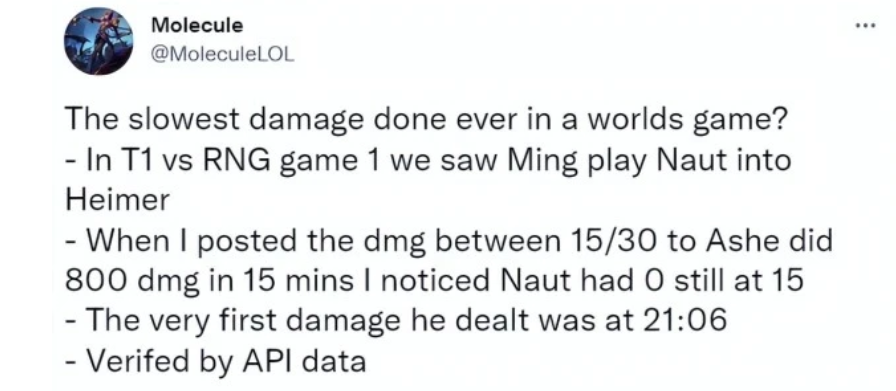 而在战队成绩方面,更是遭受了不少嘲讽,被T1以3:0零封,被打得毫无还手之力,而两位老将小虎和小明更是为人诟病,一到世界赛就拉胯让人倍感失望,其中MIng选手在与T1的第三局比赛中,21分钟打出0输出,被外网扒出后,更是引发了极高的讨论度,同时不仅是MIng被全球玩家讨论,RNG世界赛有趣的成绩图,也引发了极高的热议。