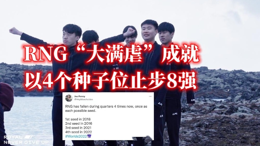 来到S11赛季,RNG季后赛一轮游进入冒泡赛,但随后成功击败了WE获得三号种子,出征世界赛小组赛出线之后,LPL迎来内战,鏖战五局不敌EDG,最终倒在了8强赛;而今年的S12赛季,RNG在季后赛同样一轮游,冒泡赛最终击败LNG拿到4号种子,但这一次的结果大家都知道,输给T1止步8强,RNG完成了4个种子止步8强的成就。