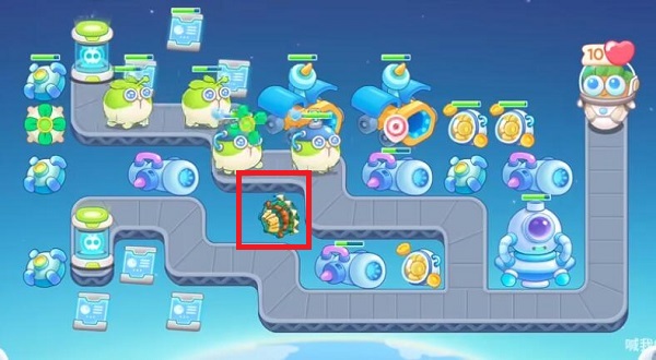1、进入关卡,在下图红框位置放置1个分裂炮台,可以在攻击怪时同时攻击其他建筑物。
