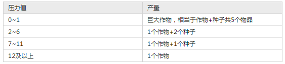 作物成熟时累积的压力值将决定产量。累积压力值越大,产量越少。只有压力值在0~1的作物才会长成巨大作物。但这种影响有限,无论压力是多少,一个种子最终都会至少获取一个作物。具体如下表