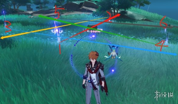 以紫色球一开始所在的剑柄为第一个,然后依次去触碰剑柄红、黄、蓝、绿、灰。