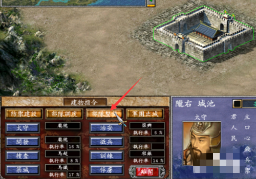 4、点开城池之后,点击上面一栏指令的部队调整。