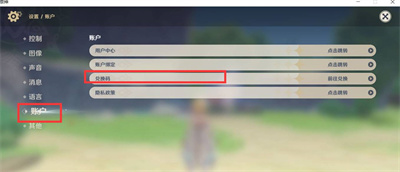 3、在设置界面里,点击账号界面,可以看见兑换码的输入栏;