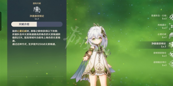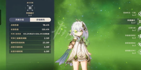 基于纳西妲元素精通超过200点的部分,提升灭净三业的暴击率与伤害,至多提升灭净三业24%的暴击率和80%的伤害。