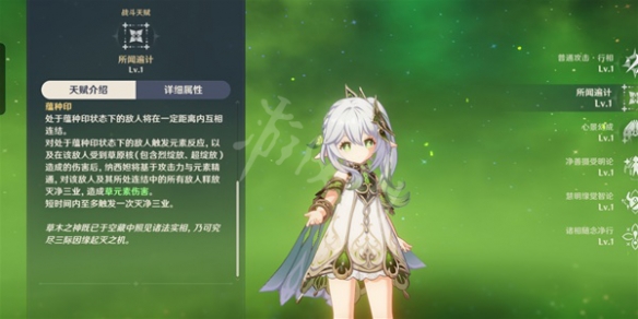 在处于蕴种印状态下的敌人在一定距离下相互连接,并在敌人收到草原核的伤害之后纳西达基于元素精通与攻击力对敌人及其连接敌人释放灭净三业造成草元素伤害。