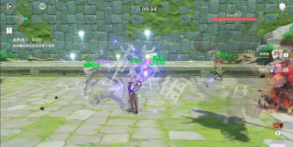 此挑战主要是利用草元素+雷元素反应来击败敌人,在战斗期间需要不断切换纳西妲和刻晴来触发元素反应,简而言之就是注意敌人头上有草元素标记就切换刻晴,有雷元素标记就切换纳西妲。