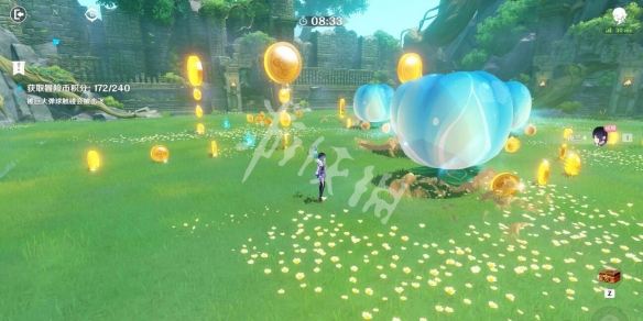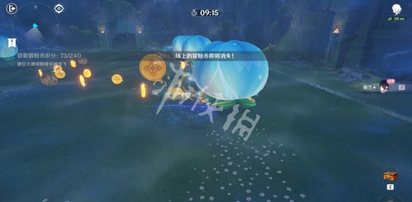 每次金币出现之前,注意观察巨大蓝球下方会显示它的初始移动方向,可以参考提示来移动避免碰撞。若在元素战技持续期间被弹飞的话会浪费不少时间,因此要尽量避开蓝球,不过限制时间很充裕,也不用太担心时间用尽。