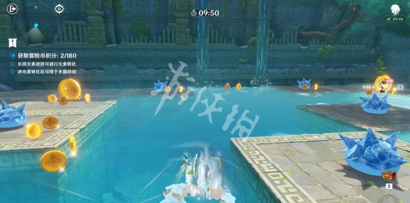 此挑战主要利用早柚的元素战技(长按)与冰史莱姆触发元素反应快速在水面上移动来拾取金币,小金币1分,大金币5分,累积获得180分可以完成挑战。