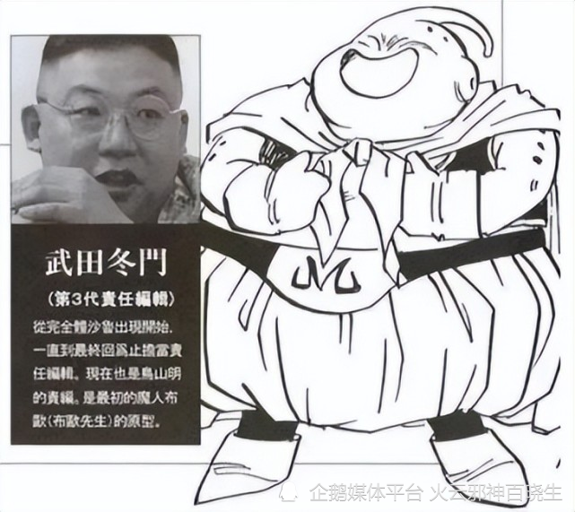 鸟山明的第三代编辑武田冬门则是胖布欧的原型,武田冬门是鸟山明的迷弟,对于《布欧篇》的创作基本采取鸟山明高兴就好,你画啥我都没意见。所以鸟山明塑造了天真可爱的胖布欧。