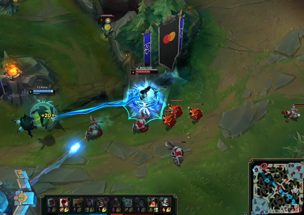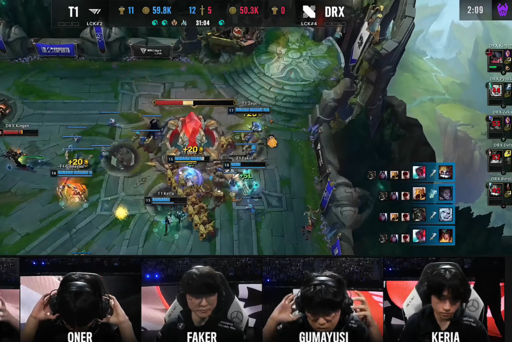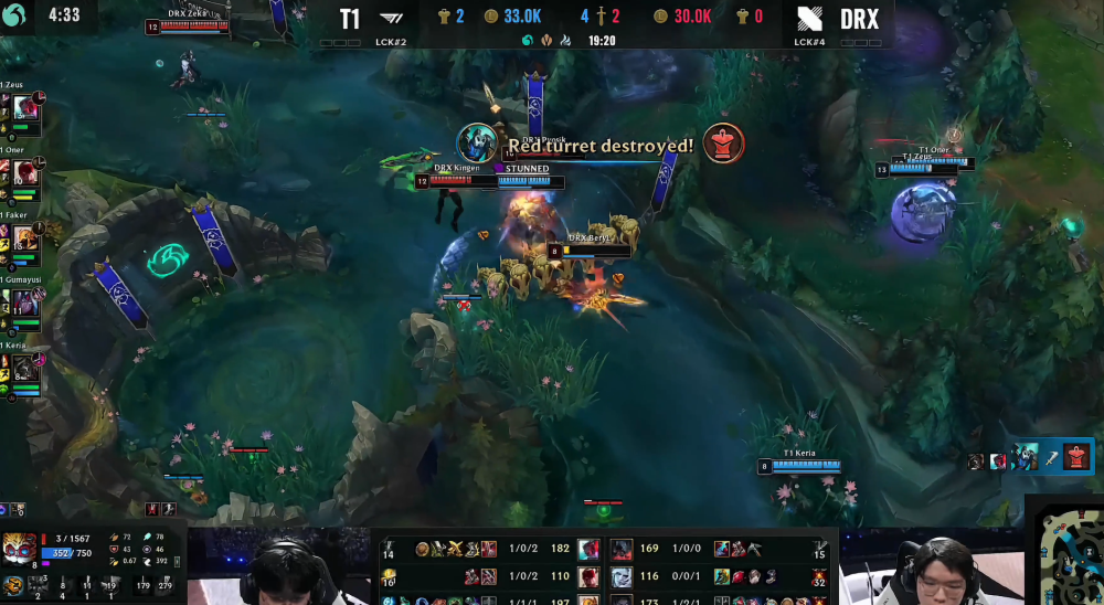 19分钟DRX战队终于找到机会蹲到T1双人组,但Zeka塞拉斯大招跟晚了,被韦鲁斯闪现逃跑,自己只换了个辅助。