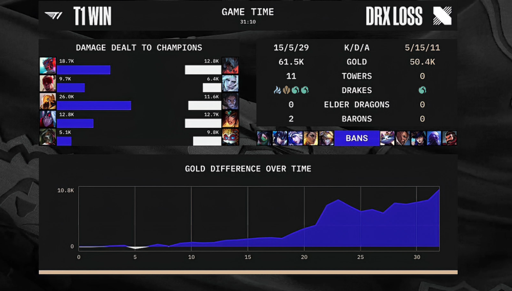 从这波团战以后DRX战队彻底崩溃,被T1队员轮流开秀,丢塔丢大龙丢高地,经济差距完全止不住。最终T1战队带着水龙魂和三路超级兵轻松碾压DRX,赢下第一场比赛的胜利!