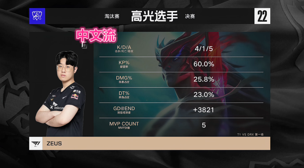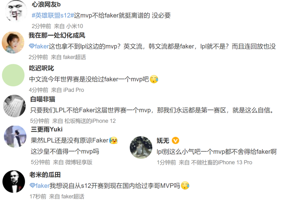 赛后S12中文流解说台把MVP给到上单Zeus永恩,他对位领先四千经济,团战也确实敢打,但这个MVP归属引起Faker粉丝的不满。毕竟宙斯已经在本次世界赛拿过五个MVP了,而Faker在中文流却连一个MVP都没拿过。