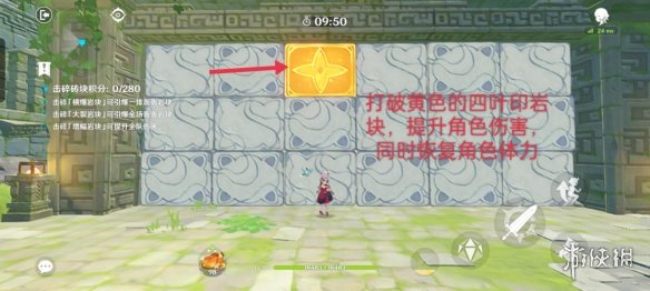 打破黄色的四叶印岩块,提升角色伤害,并且恢复角色体力值。