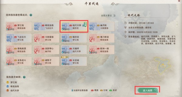 3、打开地图后先看本服颜色,是否是你的阵营的颜色,蓝色浩气盟,红色恶人谷,只有同色才能挖矿,如果本服颜色不符,可以选择其它符合的区服进入。