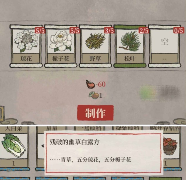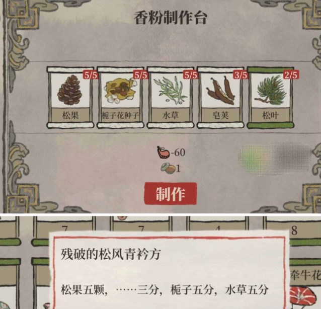 5、以上就是万花会四种香粉配方,注意即使配方正确,香粉在制作过程中仍有概率失败,加入「松叶」×2可提高成功率。