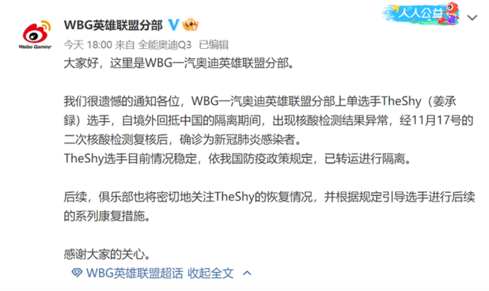 不过让人始料未及的是,在隔离期间The shy出现核酸结果异常的情况。根据WBG俱乐部在今日发布的微博,也是向关注他们的粉丝公布了The Shy隔离期间遗憾确诊新冠的消息,并且已经按照防疫规定转运隔离。