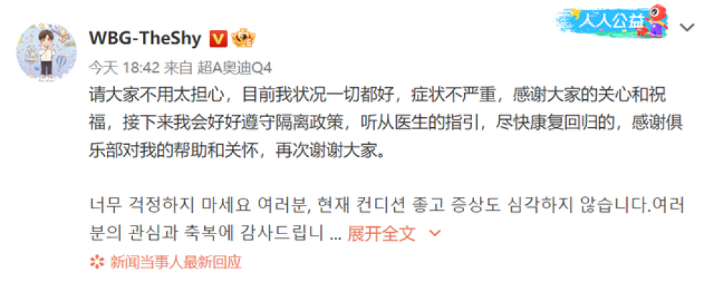 在收到来自粉丝、队友以及老朋友的关心和祝福后,The Shy也是在社交媒体平台发文称请大家不要担心,目前自己的状况一切都好,症状也并不严重。在文中Shy哥也是向粉丝和俱乐部表达谢意,并表示自己会尊重防疫规定进行隔离,听从医生指引争取尽快康复回归。