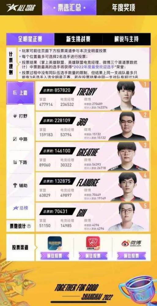 在此次LPL全明星赛投票通道开启后,微博、掌盟以及英雄联盟电竞经理三个投票渠道中,Uzi、The shy以及Meiko这几位观众耳熟能详的人气选手都是排名靠前。不过让人感到十分意外的是,作为今年LPL夏季赛冠军以及S赛成绩最好的JDG战队,他们的五名首发里却只有369一人的得票数位居所在位置的前三名。