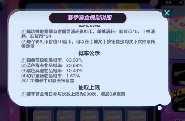 1、首先根据抽奖概率公示我们可以知道,绿色高级物品概率,63.99%,蓝色稀有物品概率23.89%,紫色典藏物品概率10.49%,幻彩至臻物品概率1.63%,170抽必中幻彩至臻盲盒。
