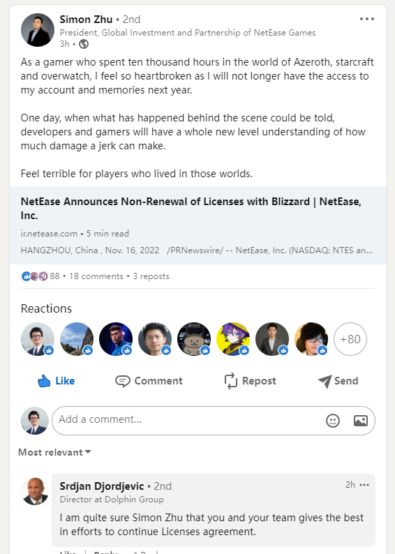 反观这次解约之后,他们会容易陷入玩家的舆论风波之中,承担着口碑崩盘的风险。以至于,网易游戏全球投资与合作总裁朱原在社交媒体上吐槽,“how much damage a jerk can make.”