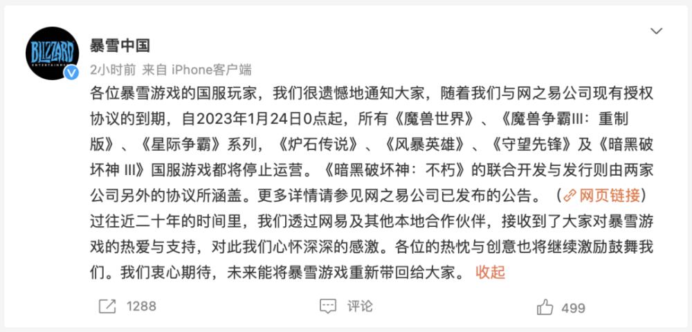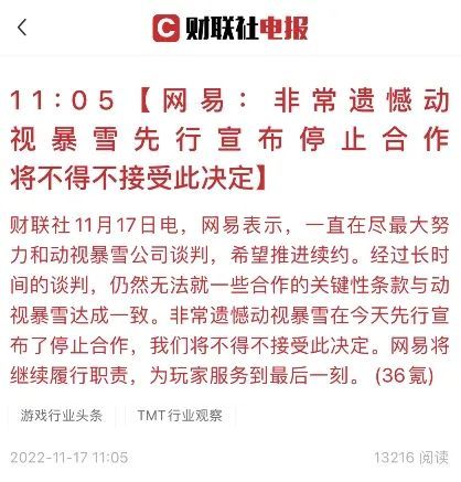 随后,网易也发布公告印证了这则消息。“非常遗憾动视暴雪在今天先行宣布了停止合作,我们将不得不接受此决定。”