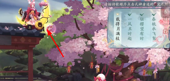 2、【驻樱望有时】然后在右边的樱花树下找到樱花妖,点击交互,完成第二个谜底。