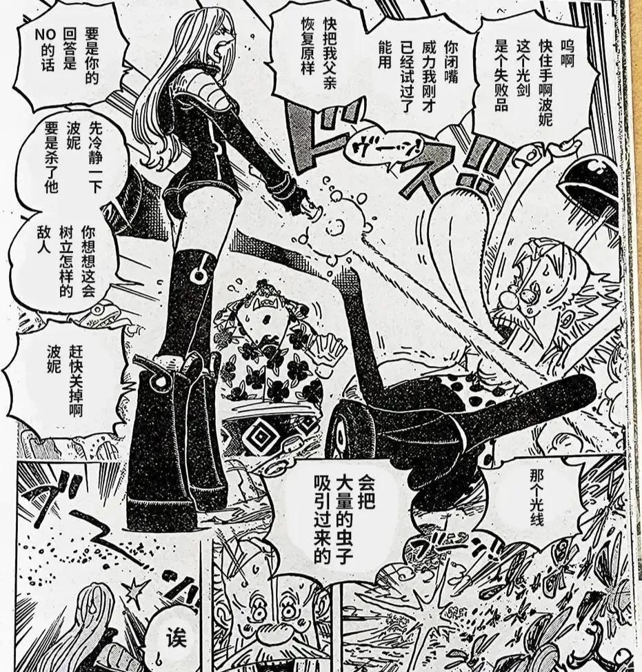她手中的闪光剑是失败品,波妮以为贝加庞克在骗她,毕竟她刚才已经试验过闪光剑的威力。闪光剑很快就引来一群甲虫,波妮被甲虫吓晕了,堂堂过亿的海贼,居然害怕甲虫,路飞都嘲笑波妮了,她晕倒在地上,口中还吐白沫。