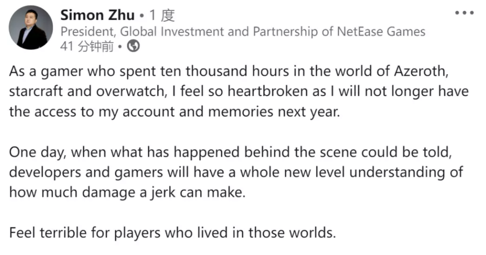 双方宣布终止合作后,网易游戏全球投资及合作总裁朱原称暴雪某人为「混蛋」
