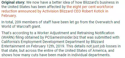 第二点是减少研发预算和裁员。例如在收入保持增长的2019年,动视暴雪依旧宣布裁员8%(约800人)。随后 PCGamesInsider.biz 获得的美国加州(WARN)劳工法案文件资料显示,已有209名暴雪员工已收到遣散通知,其中大部分来自于《守望先锋》和《魔兽世界》项目组。