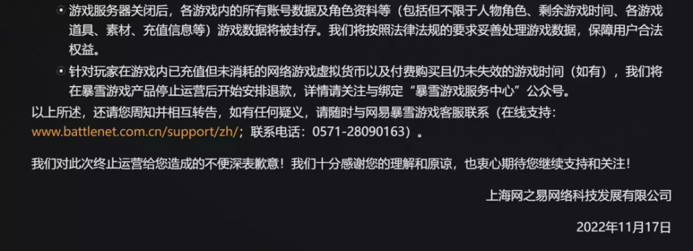 同时网易将与动视暴雪公司一起,做到「商业的归商业,游戏的归游戏」,重视玩家的呼声,从速制定方案,尽快启动退款等相关工作,并将通过「暴雪游戏服务中心」公众号等官方渠道,持续通报相关工作进展。