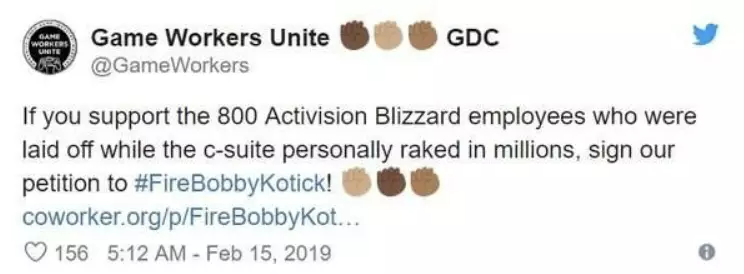 随着暴雪裁员和削减预算的动作展开,这两年暴雪员工多次发起抗议。美国游戏工人联盟也带领暴雪员工发起了「解雇动视暴雪CEO Bobby」的请愿,请愿信中称「Bobby的财富建立在偷取工人工资的基础上,在他的领导下动视裁了8%的员工,却给了一个刚刚上任的CFO 1500万美元的酬劳。」