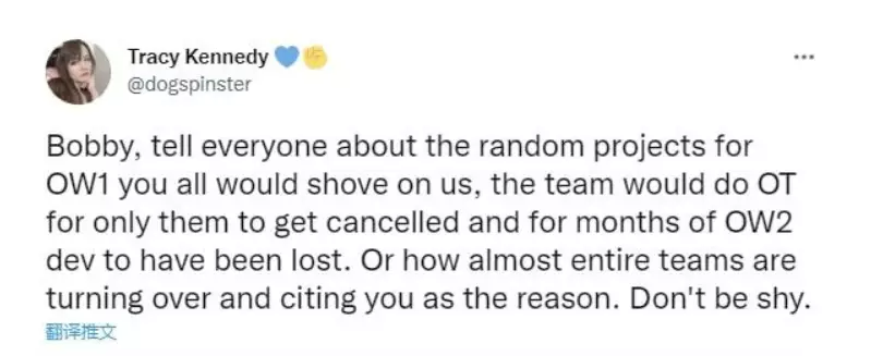 对此,暴雪《守望先锋》制作人Tracy Kennedy发文驳斥这种说法,她表示《守望先锋2》研发进度问题,跟Bobby要求研发的临时项目取消有关,希望他不要把问题推给团队。