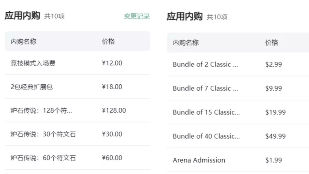 《炉石传说》国服(左)与美服(右)内购定价对比,来源七麦数据