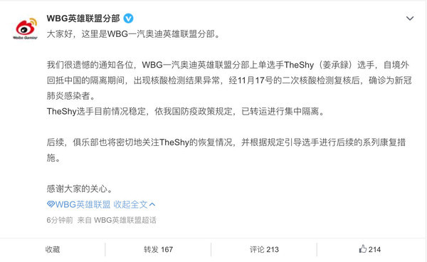 11月17日,@WBG英雄联盟分部发公告称,队内上单选手TheShy已确诊新冠,但目前情况稳定,已进行集中隔离。